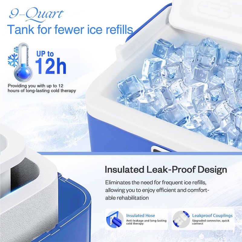 - After-sales Guarantee: The cold therapy unit includes a 9-quart cooling water tank with a cover, silent pump technology, 7.2-foot insulated tubing, knee cold therapy pads, a controller and detailed instructions for use. We are committed to providing good customer service. If you encounter any problems, please feel free to contact us and we will give a satisfactory solution immediately.
