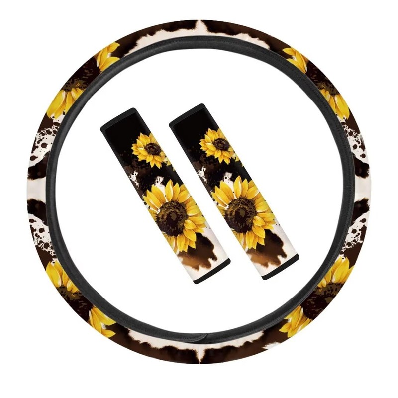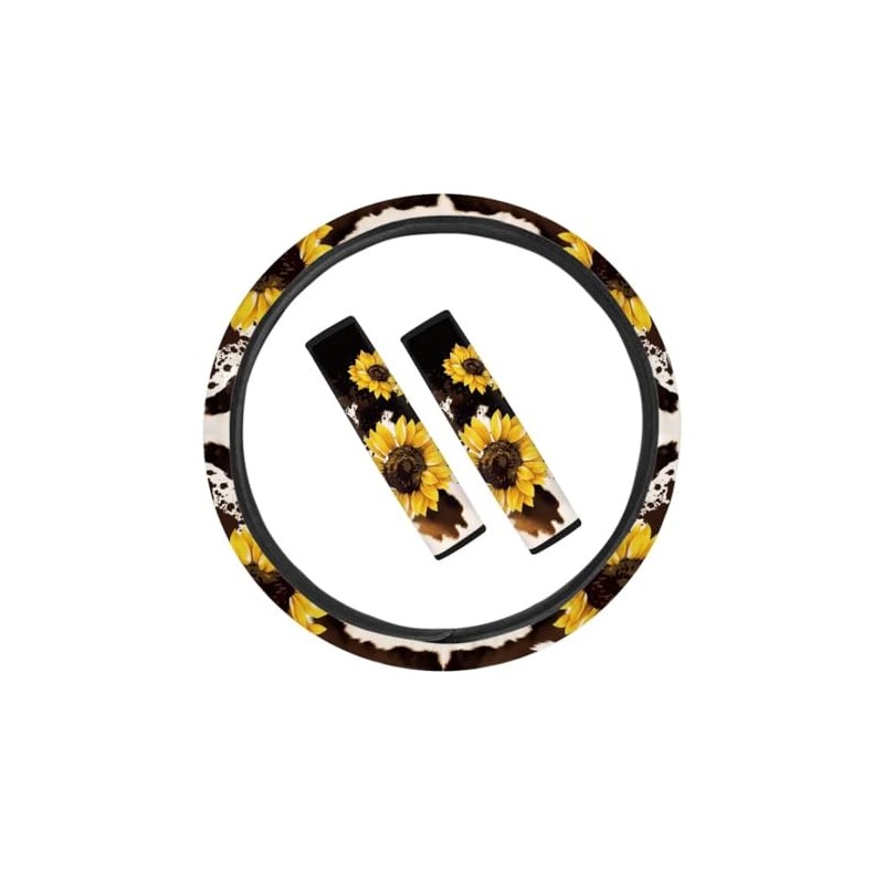 Coldinair Brown Cow Print Universal Auto Steering Wheel Cover and Soft Comfortable Car Seat Belt Sunflower Shoulder Strap Fit for Cars,SUVs,Sedan for Men Women