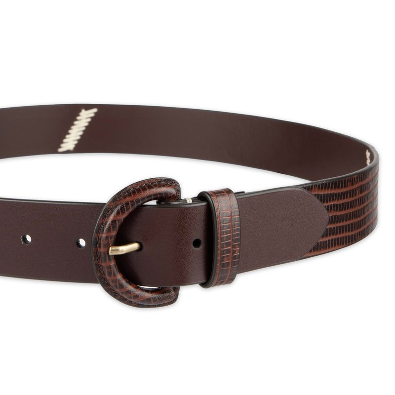 - DIMENSIONAL DETAIL: The lizard print emboss along the buckle, belt loop and top end of strap adds visual interest to any look. The contrast white stitching to a smooth leather strap creates a fashionable, two-dimensional style.