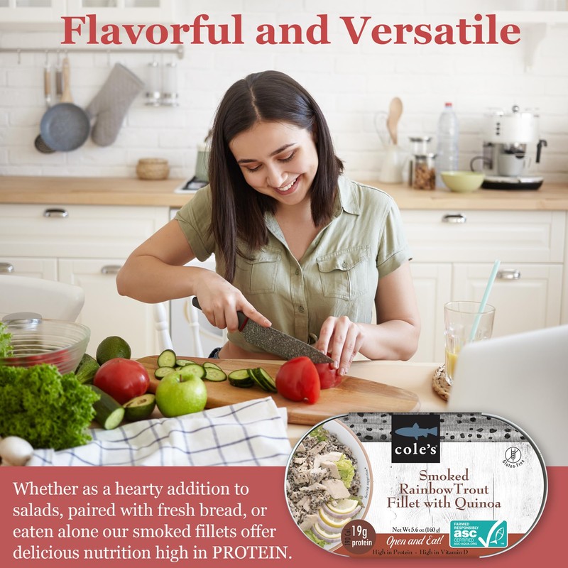 - SUSTAINABLY-RAISED FISH - Discover Cole's Seafood Smoked Rainbow Trout Fillet with Quinoa. Our sustainably sourced ASC-certified Rainbow Trout is carefully selected from farms upholding the highest standards of Best Aquaculture Practices (BAP) and Aquaculture Stewardship Council (ASC) guidelines.