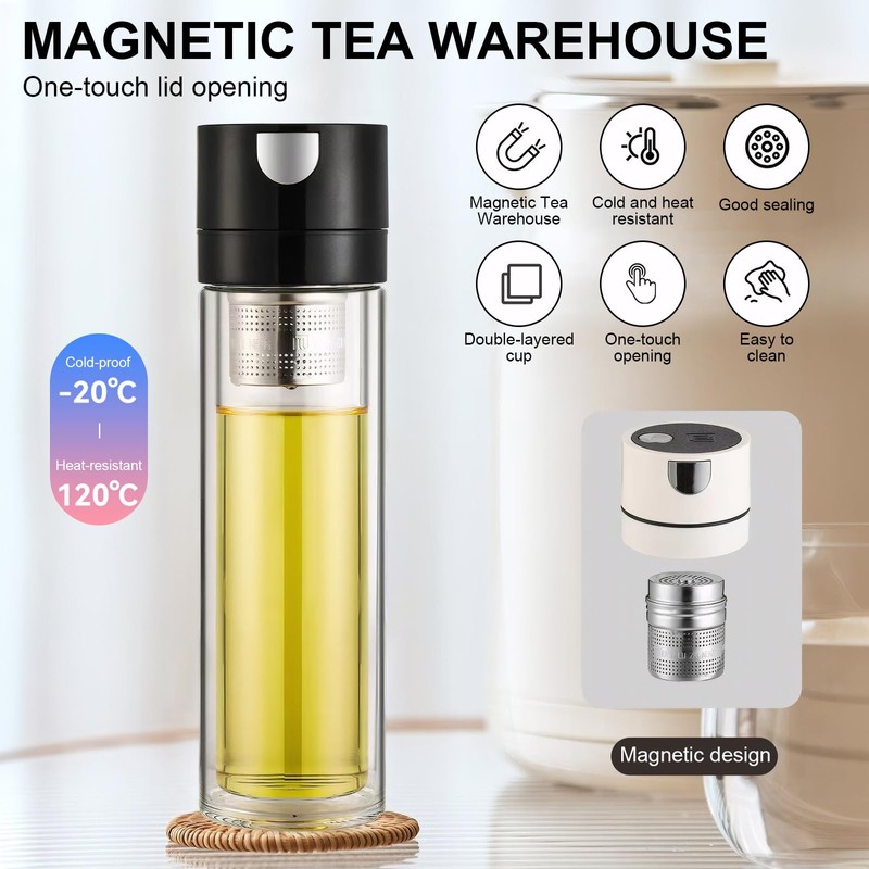 - Leak-proof design: Our double-walled glass tea cup is odourless, sweat-free and bleed-proof, so you can take it anywhere without worrying about spills or leaks. No need for buttons, turn on one click to make tea easy.
