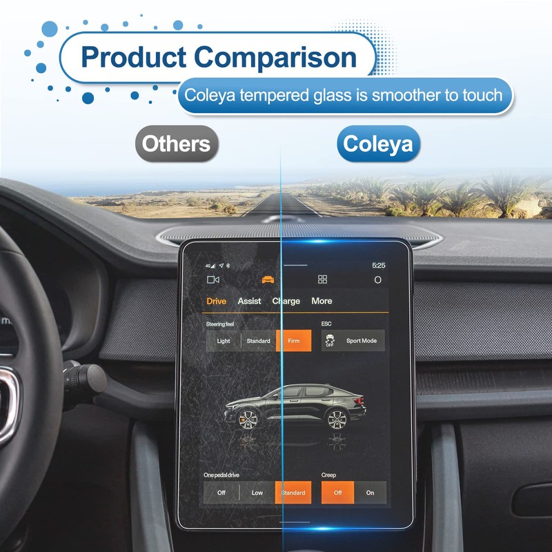 - HD&Sensitivity: Coleya 2023 2024 Polestar 2 Screen Protector of 0.26mm thick tempered glass, made of thermal nanotechnology, more sensitive to touch. 99.99% optical grade high light transmittance, enhances screen visibility, and can effectively prevent glare