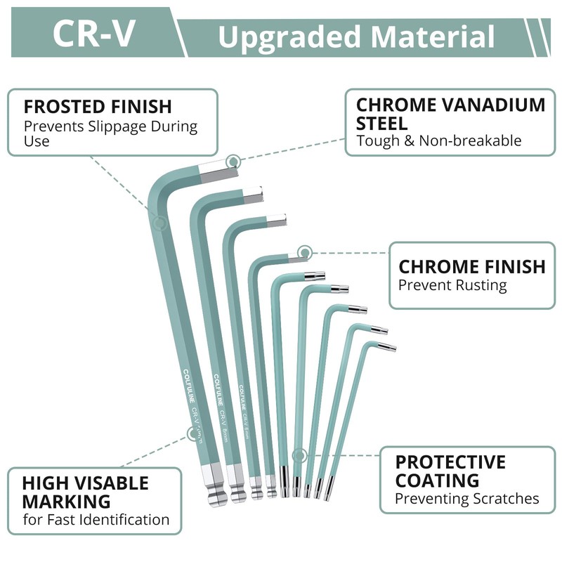 Upgraded Materials---The Hex Key Set are Made of Premium Chrome Vanadium Alloy Steel (CR-V) and 3 PCS of the Smallest Size Allen Keys are Made of S2 Alloy Steel, It Will Not Deformed and Fractured.