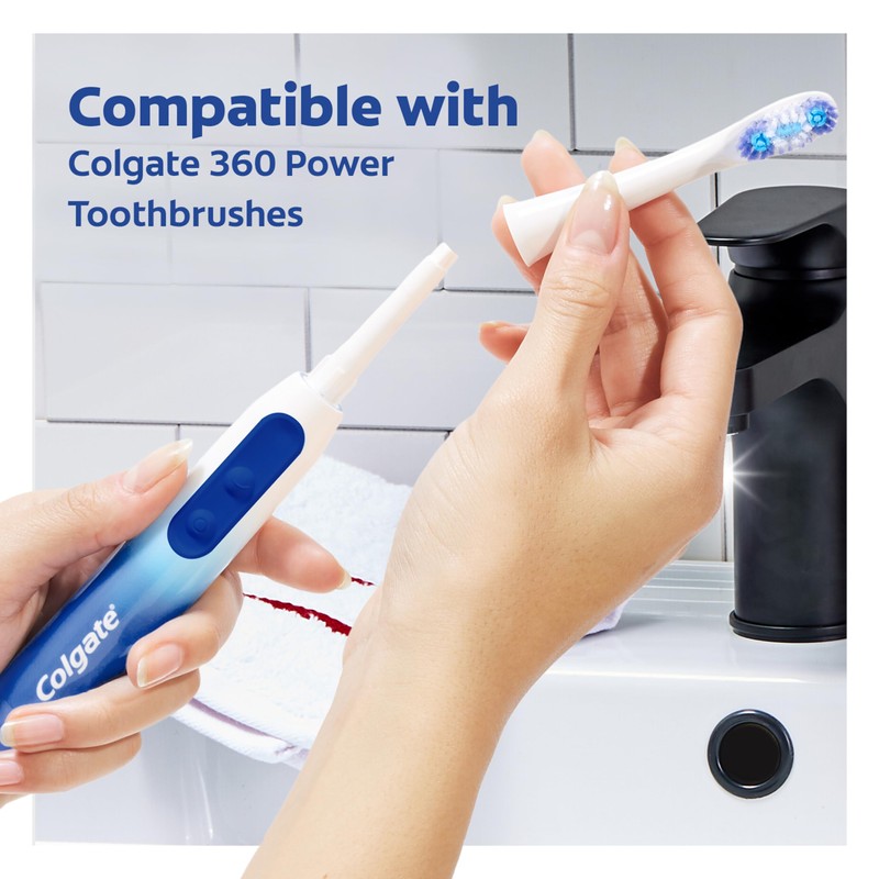 The Colgate 360 Floss Tip Sonic Refill Pack comes with two replaceable brush heads. The compact brush head includes Floss Tip† bristles and polishing cups to remove surface stains, and a cheek & tongue cleaner