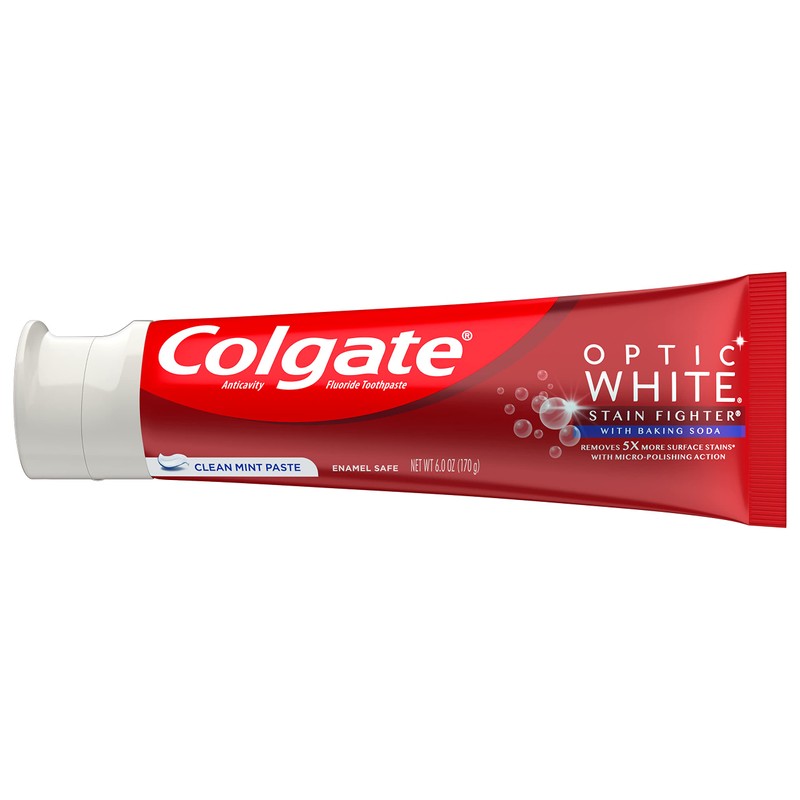 - One 6 oz. tube of Colgate Optic White Stain Fighter with Baking Soda Whitening Toothpaste, Clean Mint