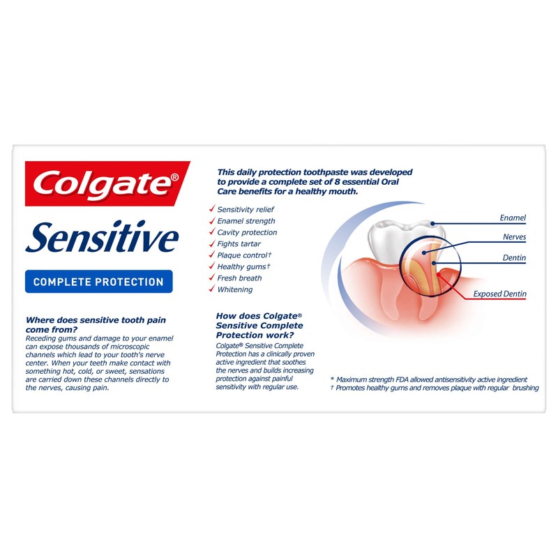 Colgate Sensitive Complete Protection toothpaste provides 24/7 sensitivity protection with twice-daily brushing and was developed to help protect against cavities, fight tartar and remove plaque with regular brushing. This sensitive toothpaste contains potassium nitrate, clinically proven to soothe the nerves in exposed dentin. With regular use, it provides long-lasting sensitivity relief. Plus Colgate Sensitive Complete Protection toothpaste is formulated to help strengthen enamel, whiten teeth, freshen breath and promote healthy gums with regular brushing.