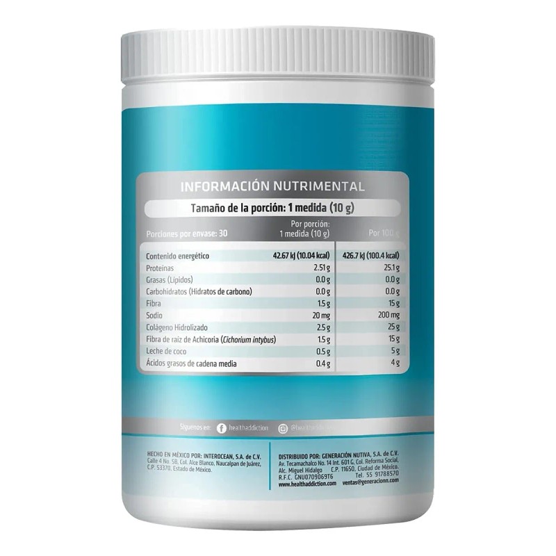 - Mejora la función gastrointestinal. Ingredientes: Su fórmula única incluye Colágeno Hidrolizado, MCT Oil, Prebióticos, Leche de Coco y Fibra, brindándote una experiencia de café más saludable y deliciosa. Instrucciones de uso: Para disfrutar de sus beneficios, simplemente mezcla una cucharada con tu café favorito. Con un contenido de 300g, queremos enfatizar que este producto no es un medicamento, sino un complemento alimenticio. Recordamos que la responsabilidad del consumo recae tanto en quienes lo recomiendan como en quienes lo utilizan, garantizando así una elección consciente y saludable. Somos HEALTHADDICTION, la primera y única filosofía de vida con un enfoque que promueve la salud del ser humano no sólo desde la ausencia de enfermedades sino como un estado de bienestar por medio de la suplementación funcional. Nuestros productos fueron co