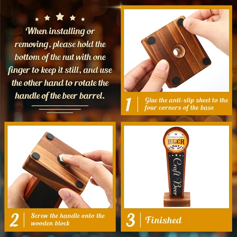 - Thoughtful Design: the beer barrel handle stand is equipped with a round anti slip pad with adhesive backing, which can keep the beer barrel handle standing firmly; Easy to install, you only need to tear off the adhesive backing, Just stick it to the bottom of the wooden display stand
