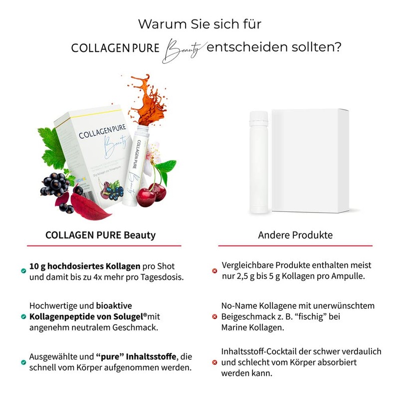 • Very good value for money – Made in Germany with 10 g of collagen per drinking ampoule – comparable products usually contain only 2.5 g to 5 g of collagen per ampoule. Marine collagen often comes from polluted waters (Fukushima) and pigs collagen from European factory farms.