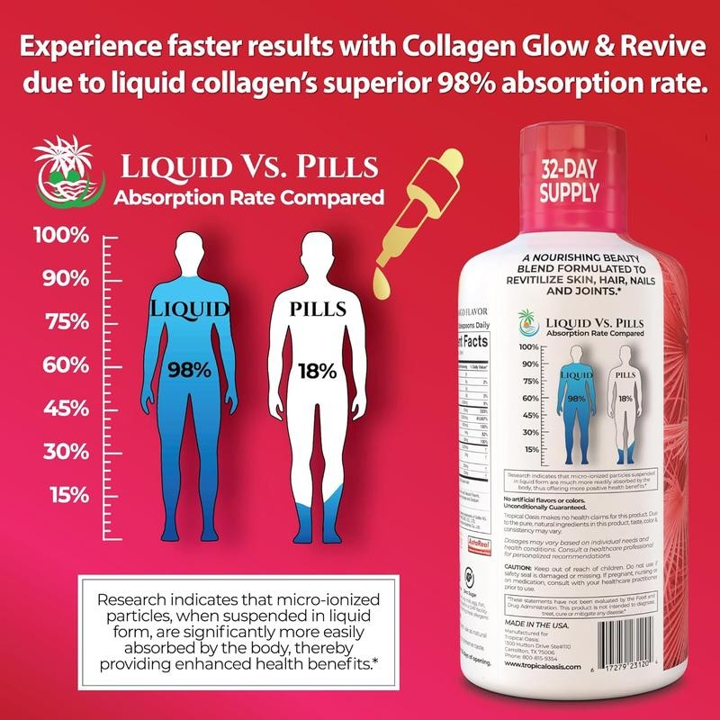 Collagen Revive + Glow Liquid Supplement by Tropical Oasis - Supports Skin Elasticity, Hydration, Hair & Nails | Non-GMO, Edible - 16 fl oz (473 ml) Healthcare Beauty:_Collagen Revive + Glow 32 oz Bottle