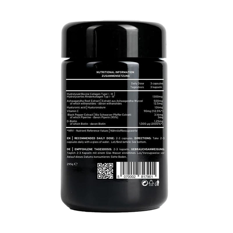 - Premium skin, hair and nails – Verisol hydrolysed collagen type I - III supports overall skin health, while ashwagandha root extract contributes to overall vitality. Hyaluronic acid promotes skin moisture, and vitamin C plays an important role in collagen formation. Black pepper extract improves nutrient absorption, and D-biotin supports healthy hair, skin and nails.