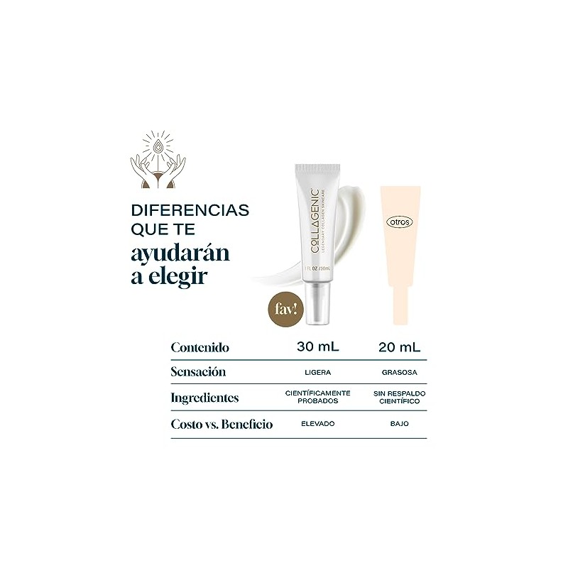 - La Crema para Contorno de Ojos Collagenic 30ml actúa como anti ojeras y protector y trae 60% más contenido que un contorno de los ojos de 14ml. Rutina de Skincare Antiedad