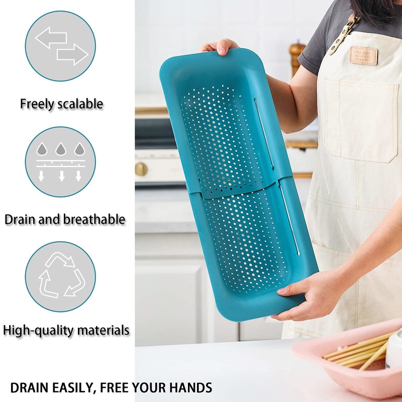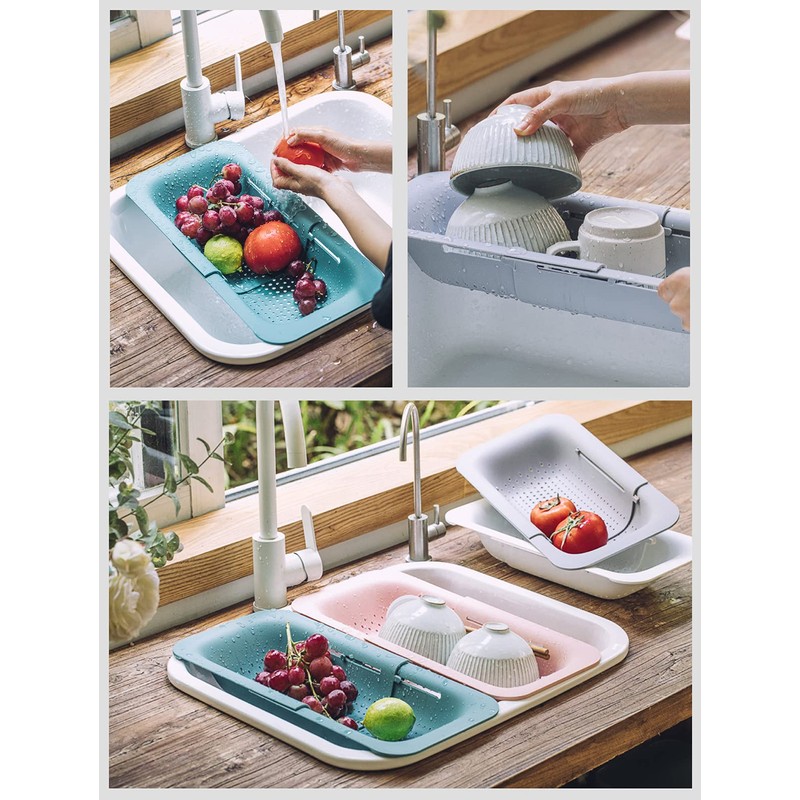 Over the Sink Colander Strainer Basket - Wash Vegetables and Fruits, Drain Cooked Pasta and Dry Dishes - Extendable - New Home Kitchen Essentials. High-Quality Materials: Our home essentials for new home colander is made of food-grade plastic, durable, healthy and environmentally friendly, strong bearing capacity, strong and thick, can be used with peace of mind Retractable Design: Use retractablehome essentials for new apartment colanders & food strainers , easy to adjust the size, The colander can be expanded from 14.3 inches to 19.4 inches,free expansion and contraction, flexible use, so it can perfectly fit different size sinks as strainers for kitchen Efficient Drainage: Our products are hollowed out, and the drain holes at the bottom are evenly distributed, which can quickly drain the water, and it is breathable and keeps dry Keep Kitchen Countertops Clean: Have you ever experienced the difficulty of draining the dishes? Is the kitchen countertop at home always wet? Our product can solve these troubles for you and become your kitchen storage artifact Multipurpose: Suitable for rinsing fruits and vegetables in the kitchen, used as a basket on the workbench, used as a filter above the sink, or air-dried dishes, this is ideal for filtering, washing and rinsing