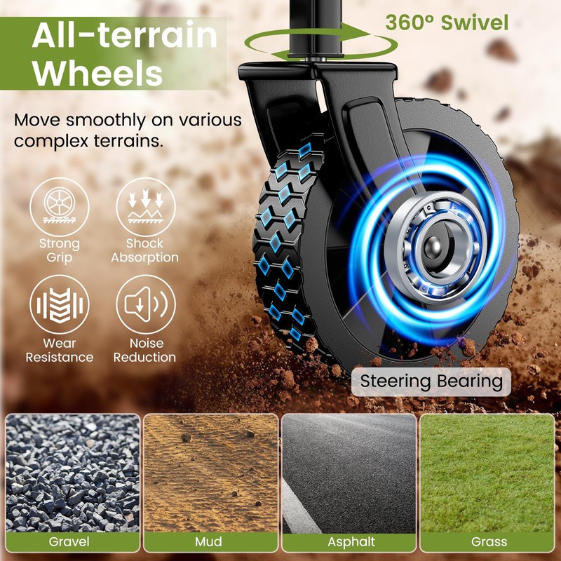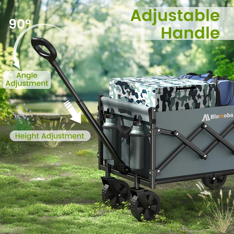 - 360° Wheels & Flexible Handle: Equipped with 360° rotatable wheels, this collapsible wagon ensures easy and smooth control. Whether on rough mountain trails or smooth sandy beaches, it glides effortlessly. The handle is not only telescopic but also adjustable, making pushing and pulling a breeze.