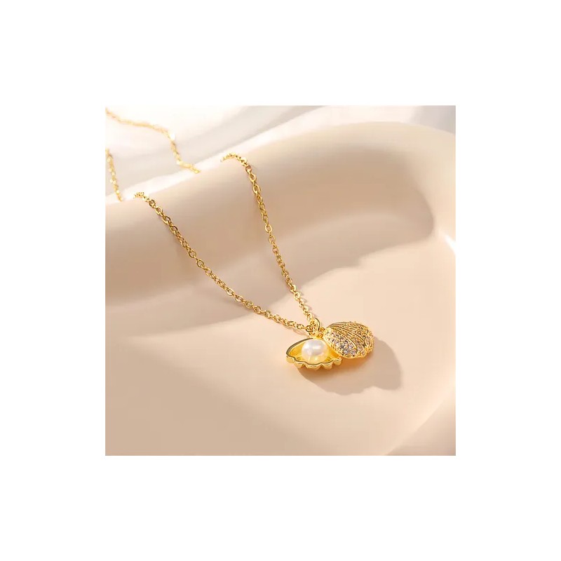 Bellísimo collar, decorado con deslumbrante dije de ostra con piedras zirconias micro pavé y perla simulada, elaborado en chapa de oro de 18K, con base de acero inoxidable ¡Luce realmente hermoso, a todos les encantará!