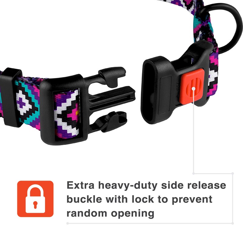- Durable side release buckle is lockable and will help you to put this nylon dog collar on and off instantly. Metal D-ring allows to attach a lead.