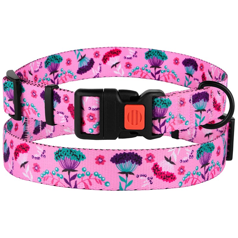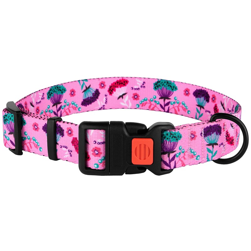 - [Strong & Flexible] - Our floral dog collar is made of a strong yet flexible and soft nylon webbing. The lockable side-release buckle is made of high-quality plastic. The carbon plated D-ring easily attaches to a dog leash.