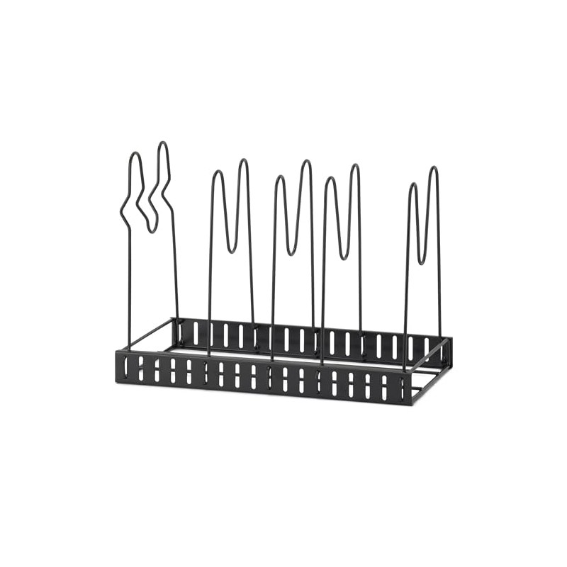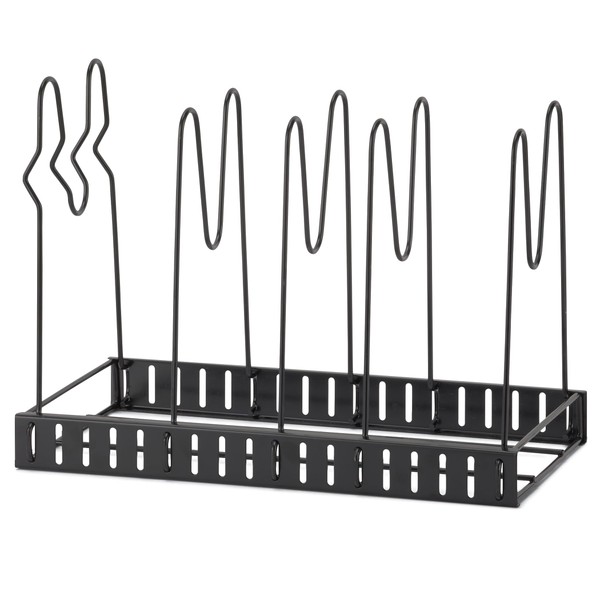 Maximize valuable cabinet and counter space with this adjustable pot and pan organizer. The versatile design holds up to 5 pans and lets you use it horizontally or vertically, plus the spacers adjust easily to fit your needs. Holds up to 5 pans. Iron. Approx. 15"L x 8 1/2"W x 11"H. Pots not incl. Includes 1 organizer rack and 5 spacers.