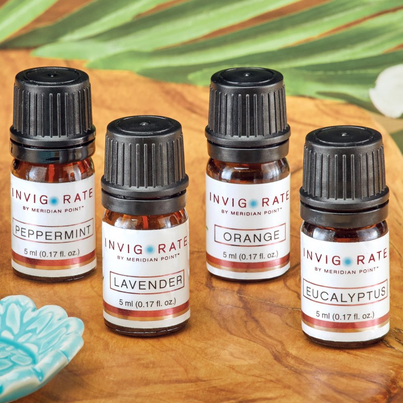 These essential oils were specially formulated to help you achieve physical, emotional, mental and spiritual well-being. Simply add a few drops of the oil to water in your diffuser or humidifier to release the scented vapor into the air for a spa-like experience in your own home. The set includes four 5 ml. bottles: Peppermint, Eucalyptus, Lavender and Orange. Set of 4.