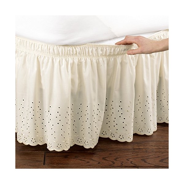 Collections Etc Eyelet Floral Scalloped Elastic Dust Ruffle Bed Skirt, Wrap-Around Easy Fit Design, Ivory, Twin/Full