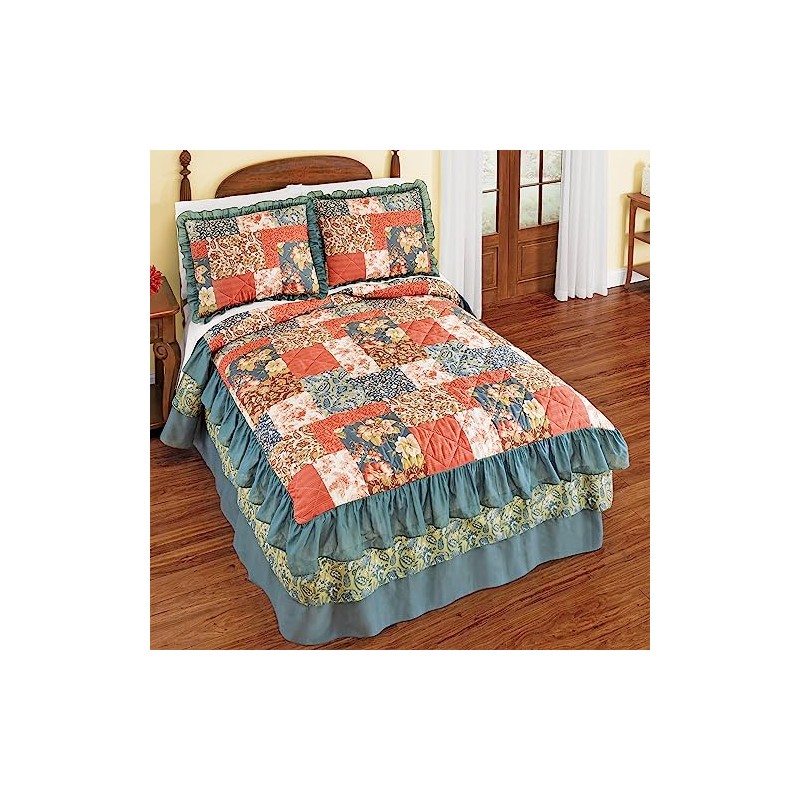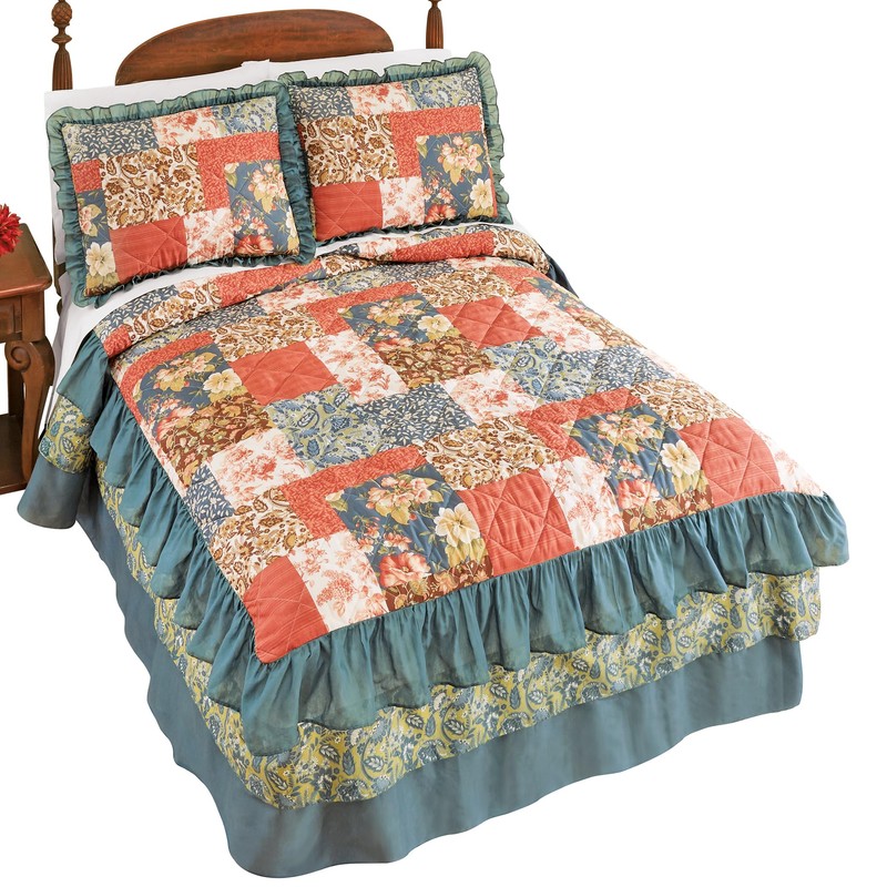 - This lovely patchwork style quilted bedspread features a collection of floral, striped and paisley patches on the top with three tiers of elegant ruffles in coordinating patterns along the sides