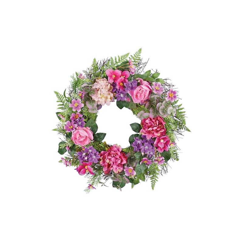 Lovely on your front door or in any room in your home, this floral wreath will add beautiful seasonal style to your home décor. A lush bed of greenery is decorated with vibrant blooms in shades of pink and purple. Hangs easily with hook on back. Vine, polyester and plastic. 18"Dia.