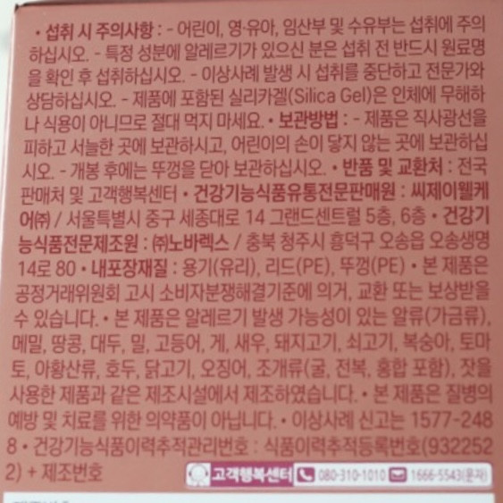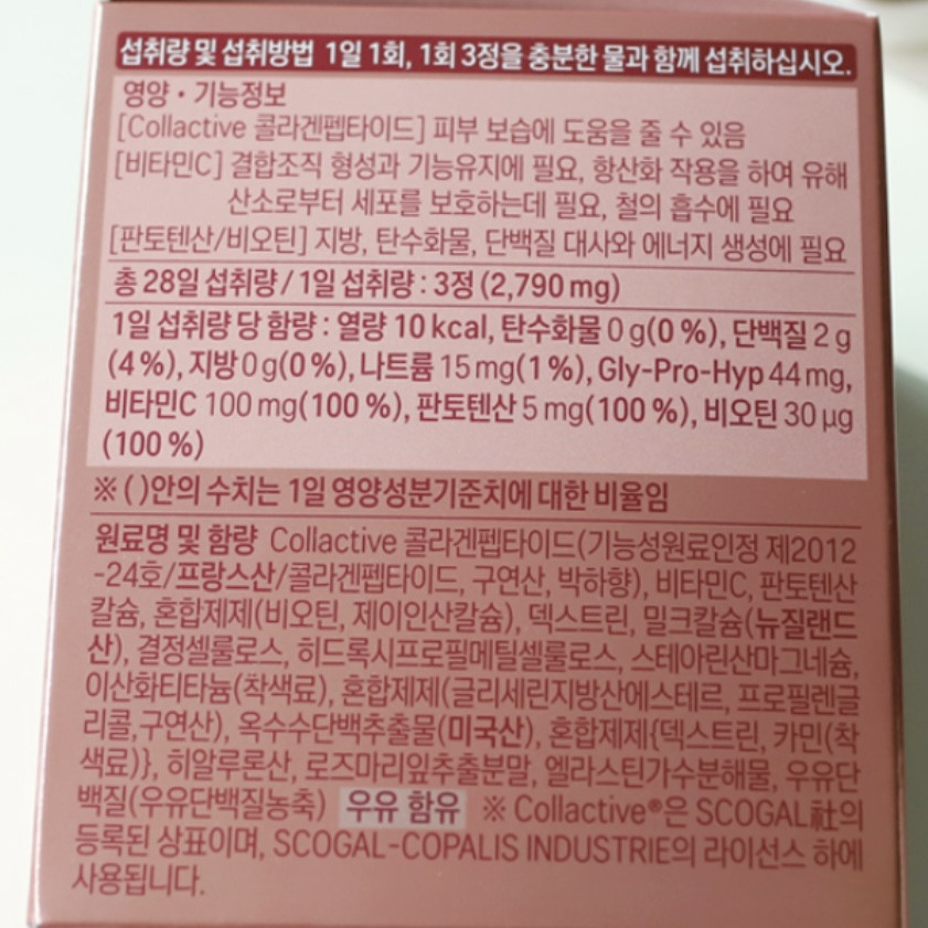 촉촉하고 탱탱한 피부를 원하시나요 !?먹는 콜라겐으로 속부터 차오르는 탄력감을 느껴보세요 ♥피부 보습 기능성 콜라겐부터 필수 영양 비타민 3종까지!비오틴,판토텐산,비타민c를 1일 기준치 100%로 가득 담았습니다.