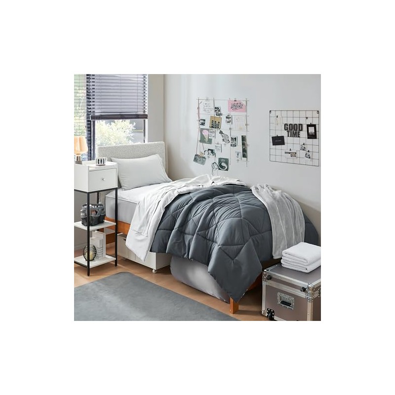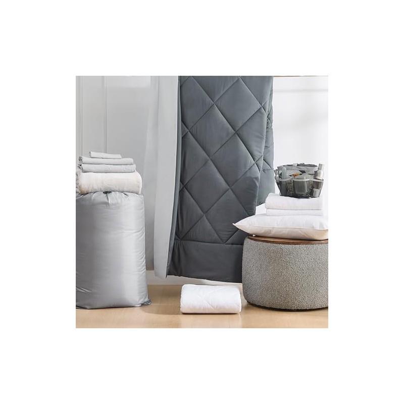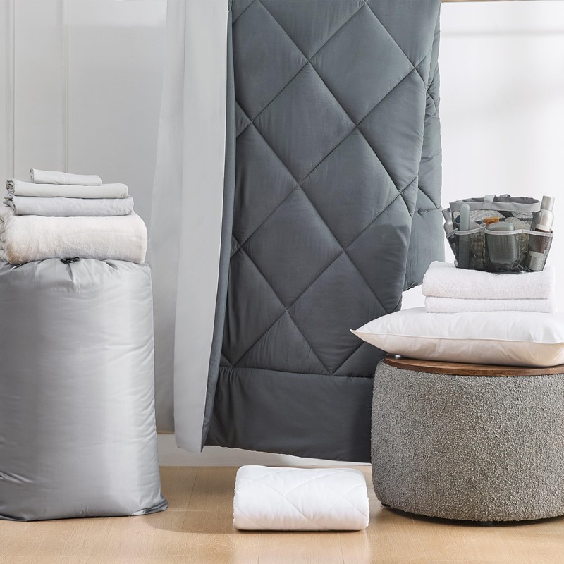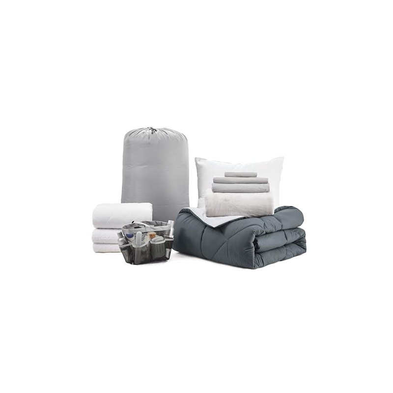Your freshman year in college can be an adjustment, but you can make it easier with the right Twin XL bedding. Getting a good night's sleep on your dorm bed will make you feel refreshed and ready for the day, so make sure your oversized college comforter is made to keep you warm and cozy. Luckily, our Faded Black/Glacier Gray Twin XL Microfiber Reversible Comforter and the matching Microfiber Twin XL Sheet Set are made with ultra cozy and super soft microfiber to give you the most comfortable Twin XL bedding. The easy to coordinate dorm comforter also has a thick inner fill for maximum comfort on your extra long Twin bed. But since the comfort of your college bedding is so important, we didn't want to stop there. Enjoy the best in comfy college bedding with the included Twin XL Bed Blanket. This plush college blanket will wrap you up in soft comfort that will help lull you into a deep sleep. Also included in this dorm pack are a true Twin XL size Mattress Pad and a Microfiber Pillow that will add extra support to your dorm bedding. Your college dorm room will also need some other college essentials, like the 2-Pack Bath Towel Set to help keep you clean and feeling fresh. The Super Jumbo Laundry Bag will hold your dirty laundry until you have time to make it to the college laundry room and wrapping up this college supplies pack is the Deluxe Mesh Shower Tote that has the perfect design to hold your dorm toiletries so that you can easily take them with you to the dorm showers.