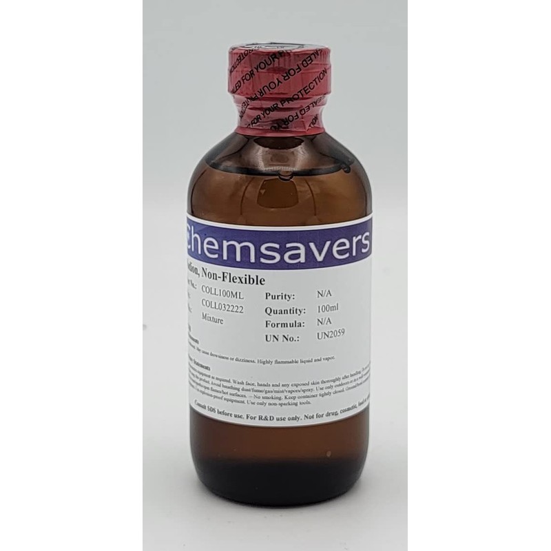 Collodion, Non-flexible, 100ml (for Photographic Applications) For Research & Development Not for drug, clinical use in humans, for food or food additive use Specifications: Appearance (Color) Colorless to pale yellow Appearance (Form) Liquid Identification A To Pass Test Identification B To Pass Test Specific Gravity @ 25 Deg C 0.765 - 0.775 Acidity To Pass Test Alcohol Content 22.0 - 26.0% Assay (by Weight of Pyroxylin) Not less than 5% Solvent-based, non-plasticized, cellulose nitrate Solution with very fast curing; non-brittle with 10% elongation. Ingredients: Ethyl ether, ethanol, Less than 7% nitrocellulose, colloided, granular. CAS: 9004-70-0 FORMULA: N/A