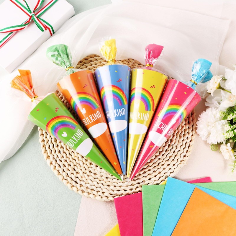 COLOFALLA Pack of 10 School Cone for Girls Boys Small Siblings School Cone School Child Rainbow Boho Sugar Bags for Filling Sibling Bag Decoration for First Day of School Farewell Gift