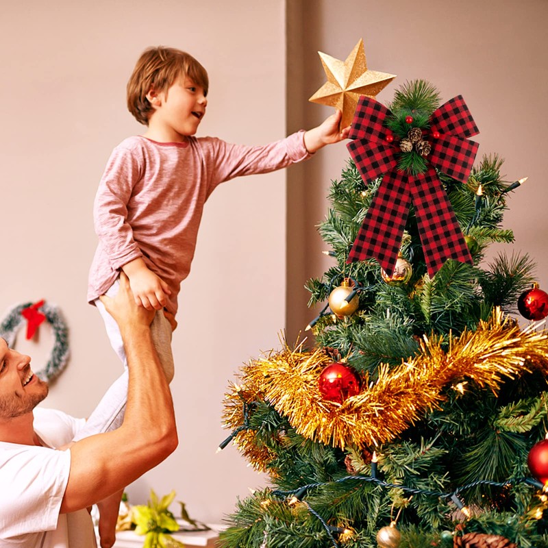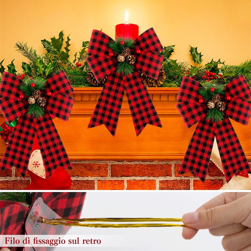 COLOFALLA Pack of 2 22.8 x 30 cm Christmas Bows Large Red Black Checked with Pine Cones Christmas Bows Bow Christmas Tree Decoration Christmas Tree Bows Decoration