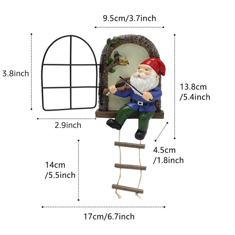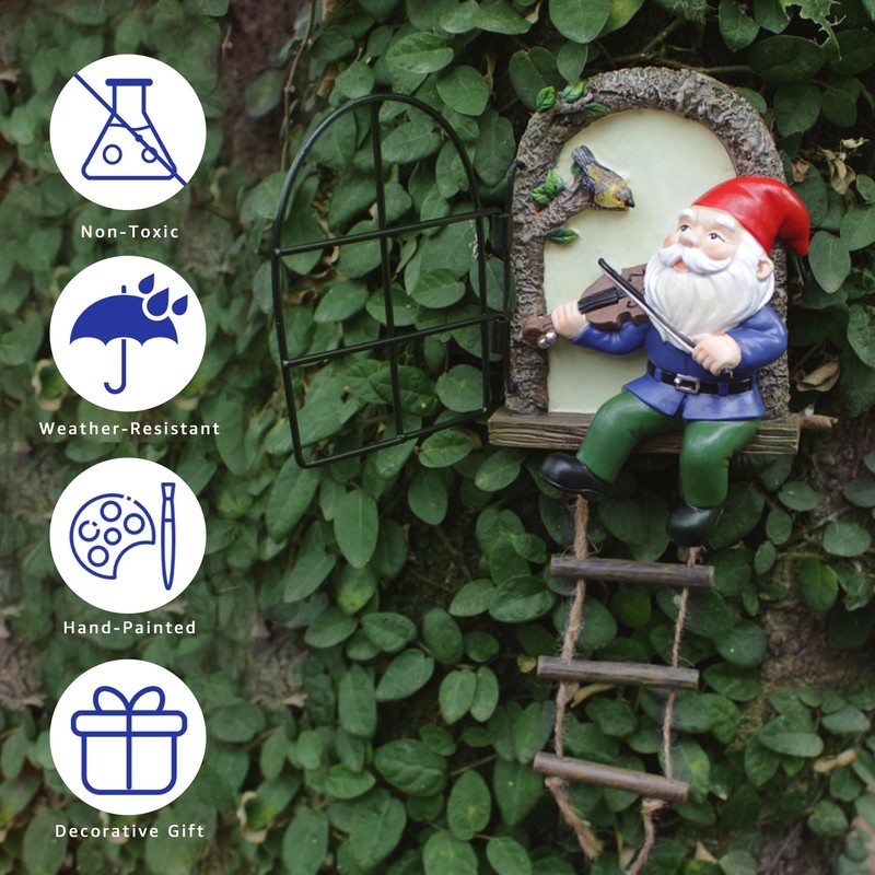 - Whimsical Design: A cute gnome playing the violin while sitting by the window, the background has a luminous vision at night. Crafted with meticulous attention to detail, our gnome tree face adds a touch of magic and whimsy to any garden or outdoor space