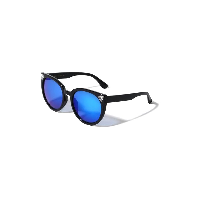Color Mirror Round Lens Triangular Diamond Rhinestone Cat Eye Sunglasses P30286-RH-CM (Blue Black)
