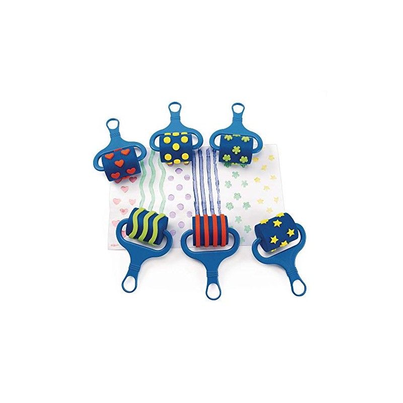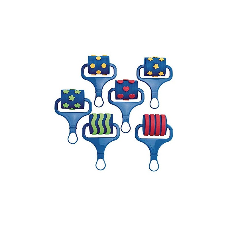 6 designs for 6 times the painting fun! big, easy-grip handles with sturdy foam rollers. Works with all types of paint and stamp pads. 7"L x 4-1/4"W x 2-1/4"H. (1 each of 6 designs: stripes, dots, Hearts, stars, flowers and waves; cleans easily with soap and water; easy to use - they really roll!; exclusive set is an excellent value) - discount school supply item # FUNROLL.