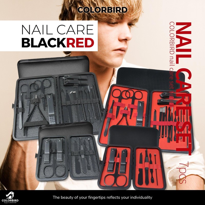 COLORBIRD ネイルケアセット 爪切り ネイルケア 爪やすり 甘皮処理 眉毛 ハサミ 毛抜き 耳かき BLACK RED (18-RED)