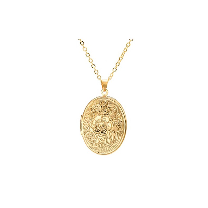 COLORFUL BLING 14k Gold Silver Women Romantic Heart Locket Necklace Engraved Flower Oval Hold Photo Picture Pendant Living Memory Jewelry-gold oval flower