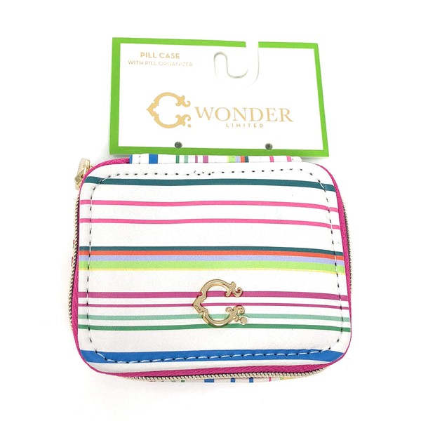 Beautiful pinstriped colorful pill case plus organizer. And close to Whit gold zipper, easy Access to pills. Container for Monday through Sunday plus extra compartment for miscellaneous. Measures 3” x 3 1/2” x 1 1/2”.