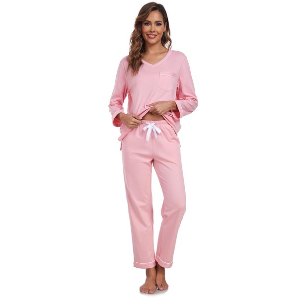 COLORFULLEAF Women's 100% Cotton Pajama Set Long Sleeve Sleepwear with Pants Soft Comfy Two-Piece Pjs with Pockets (Pink, XL)
