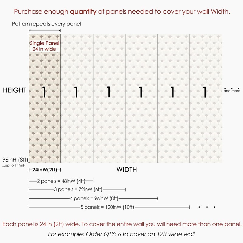 - FIT ANY SIZE: Our wallpapers are sold by the panel, and all panels of wallpaper are custom printed. Each panel is 24" inches wide with an additional 3/4" for an overlap. Select the HEIGHT option and panel QUANTITY based on your project WIDTH and HEIGHT measurements.