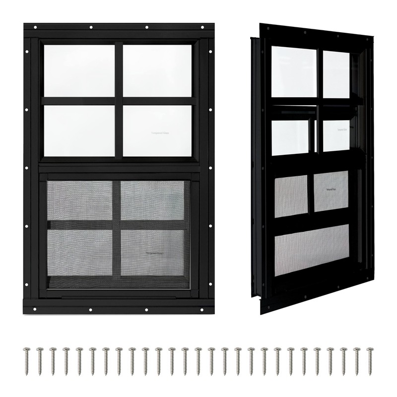 - Package:comes with 2 pack shed windows with tempered glass and screen, and there's 1 pack of stainless steel screws,You just need to insert the screw into the hole shed windows and use your own installation tool to install it! Can improve efficiency and shorten time in DIY construction