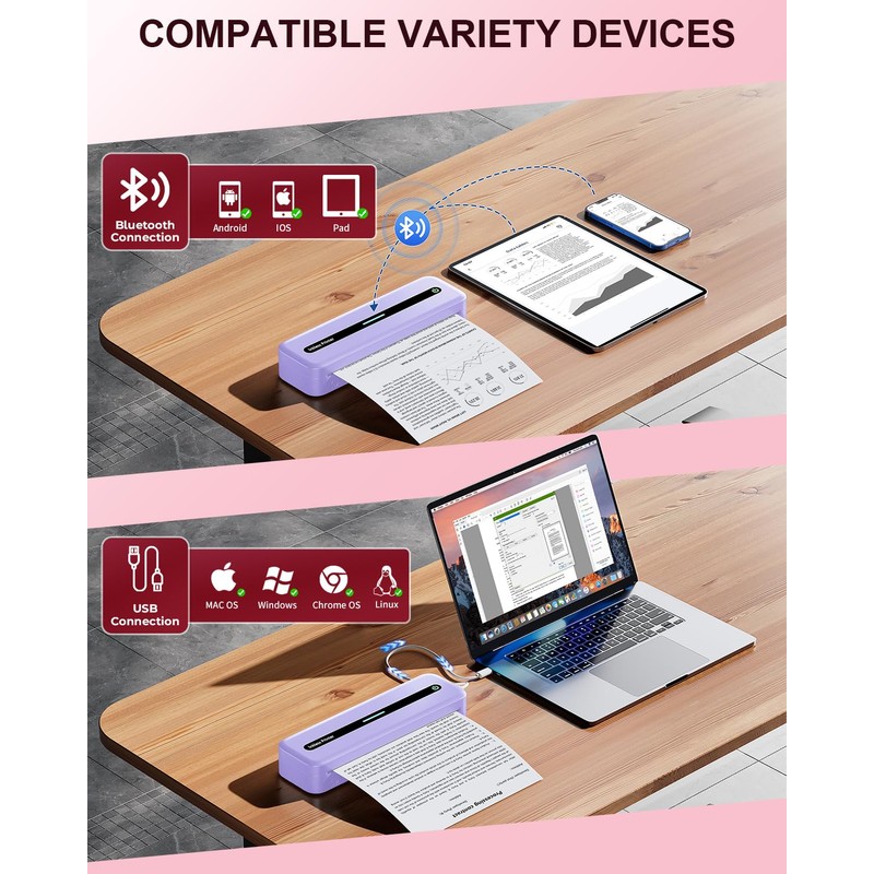 - DEVICE-FRIENDLY PRINTING: Go wireless! Print wirelessly from your phone or tablet via Bluetooth. The wireless bluetooth printer works with iOS, Android. For computers, plug in the USB. Compatible with Windows, Mac, Linux, Chrome, and Win ARM systems. Easy printing for everyone!