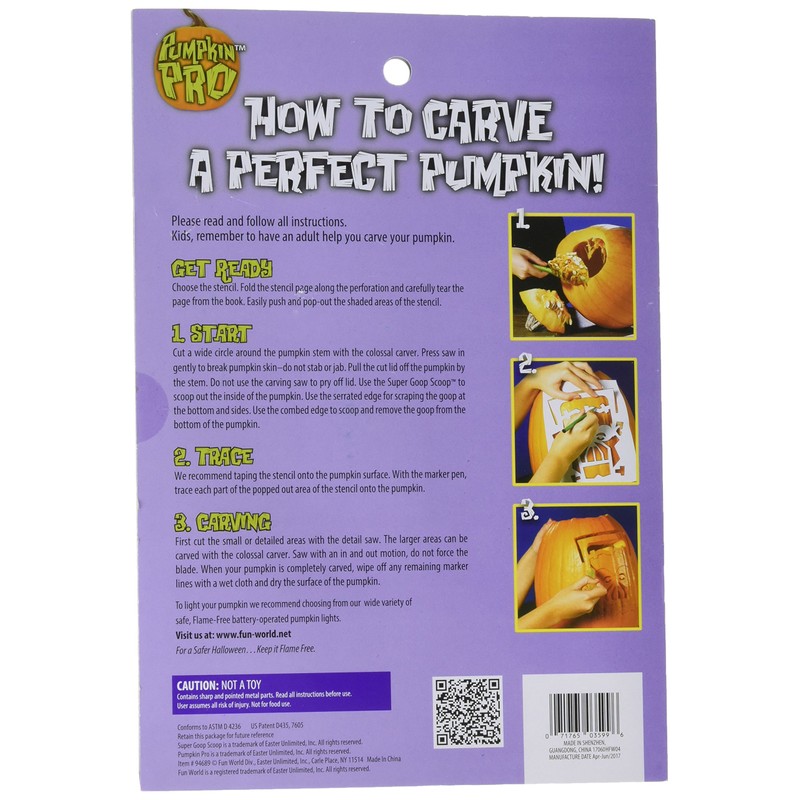 For ages 8 years & up Adult Supervision Required Carving pumpkins made easy! Super Gooper Scooper Colossal Carver Saw Detailing saw Marker 6 stencils Selection may vary by store Weight: Approximately: .35 pounds Shipping Dimensions: Approximately 10.88 x 7.5 x 1.5 inches.