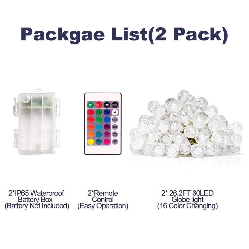 **2 Pack 126.2FT/8M 60LED Battery Powered 16 Colour Changing Globe String Lights with remote control for indoor and outdoor decorations** **Feature:** Twinkle 16 Colour Changing Globe fairy lights, beautiful decorate your garden,patio,living room, dormitories, galleries, also ideal for birthdays, wedding, party. It can be easily put or hung on walls, windows, curtains and etc. Perfect for Home, Patio,Party, Christmas, Wedding, Garden,Ramadan, Eid, Valentine's Day, festival, holiday, restaurant, hotel, commercial building, shopping center etc 16 Colour Changing LED Crystal Globe string light is suitable for creating harmonious and romantic atmosphere.Makes everyone enjoy the best moment, share the happiness and built an unforgettable memory **Specification:** Light Color: 16 Color Changing LED Count: 60 pcs /string lights Length: 25.2ft per globe string lights Power Source: Batteries Powered 4 dynamic multi-color modes: Fade / Jump / ASYN Fade / ASYN Jump Package: 2 x 25.2ft LED globe string light 2x Remote controller **Notes:** Requires 3 AAA batteries (not included) For longer battery life, use premium alkaline batteries