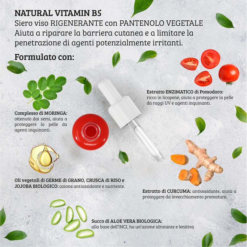 - Facial serum based on pantothenic acid, a precursor of vitamin B5, which is involved in the processes of cell regeneration of the skin. It helps restore the skin barrier and improve hydration.