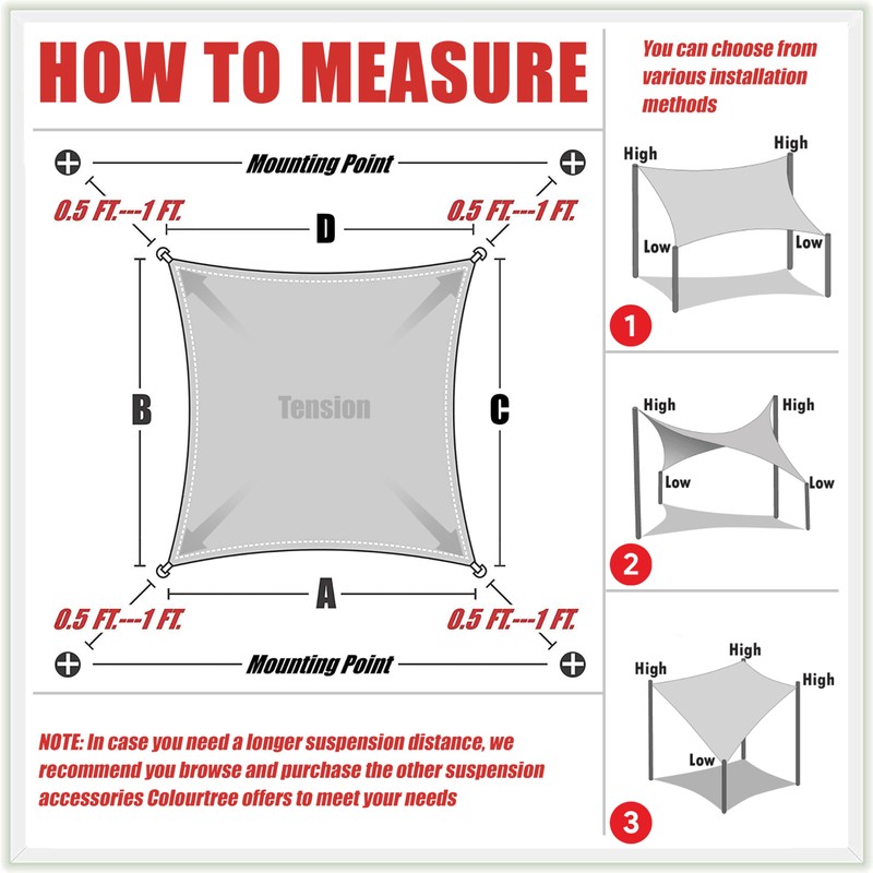 - ★【INSTALLATION GUIDE】: Installation hardware kits are requiTurquoise and sold separately, each D-ring will require one cable rope (DO NOT use nylon ropes, they break easily!!). Connect the other ends of cables to existing poles, trees or wall with shade sail hardware kits, high quality ColourTree hardware kits and cables are strongly recommended for best performance and appearance.