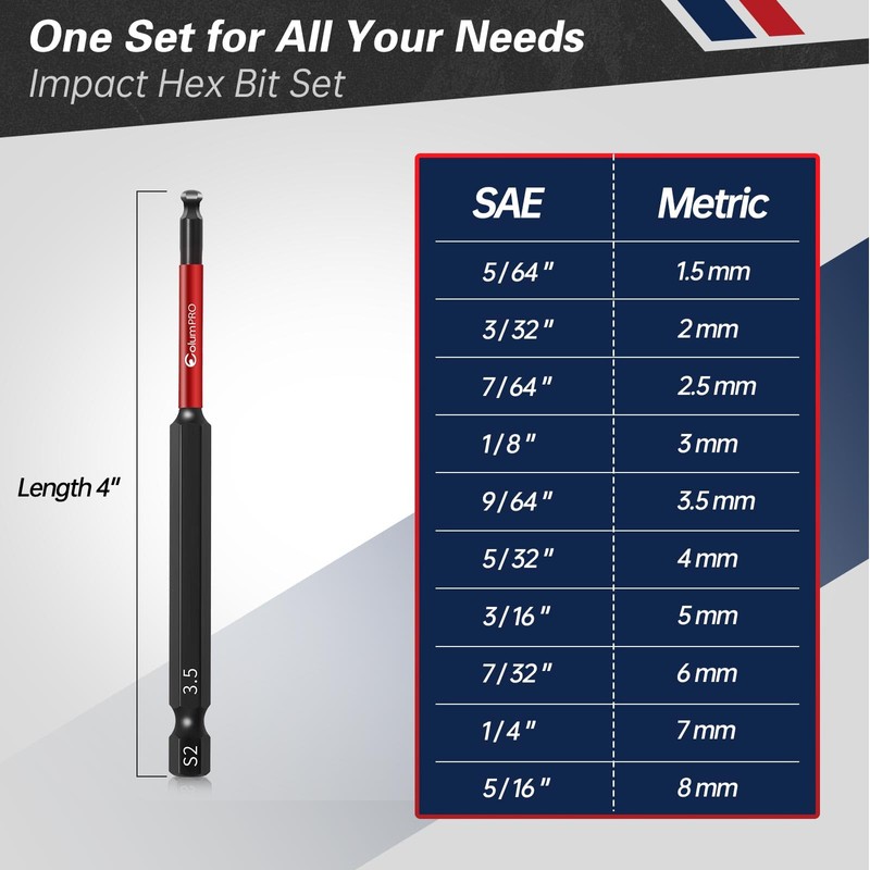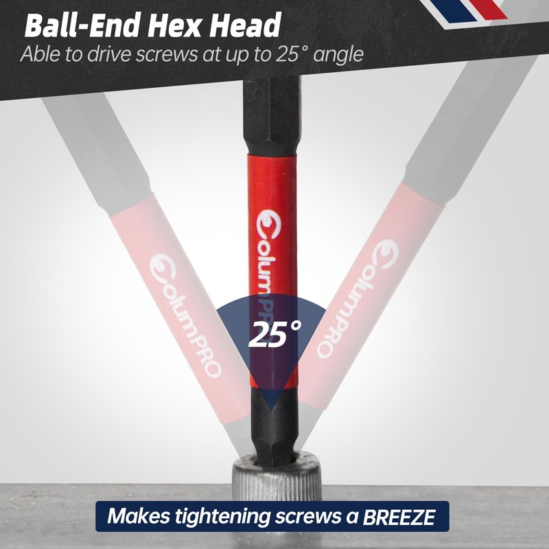 The ColumPRO Ball End Allen Wrench Bit Set offers both versatility and durability in one premium set. Made from high-quality S2 steel, these bits are designed for long-lasting performance and resistance to wear, ensuring they stand up to tough tasks. The strong magnetic tips keep screws securely in place, allowing for quick and efficient work, especially in tight and hard-to-reach spaces. With a 4-inch length and ball end design, these bits offer excellent reach and flexibility, making them ideal for a variety of projects. The 4-inch length is particularly useful in accessing more confined and narrow areas, helping you tackle challenges that standard Allen bits can't. The impact-resistant design with an integrated torsion zone helps absorb heavy torque, making these bits perfect for use with impact drivers on more demanding tasks. Whether you’re a DIY enthusiast, professional, or furniture builder, this set includes both metric and SAE sizes, offering the right tool for any job. The magnetic tip and ball end features make this set a must-have for anyone looking to improve their efficiency and precision in their work.