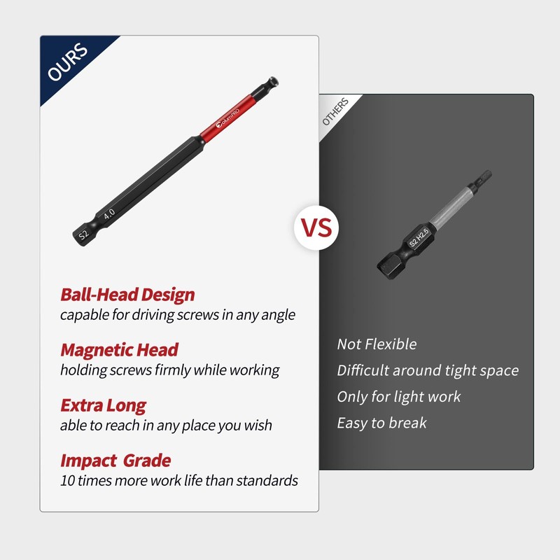 • Better Reach: The ball end head design allows for easy access to difficult angles and tight spaces, while the 4-inch length provides extra reach to navigate narrow areas, helping you solve problems in places that standard bits can't reach.