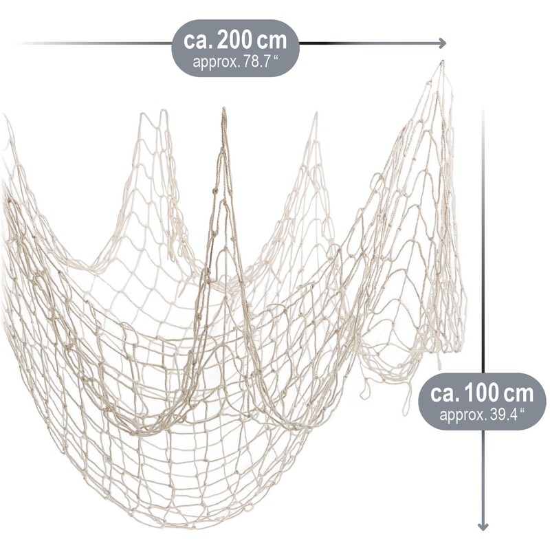 - Box contents: 1 x decorative fishing net. Dimensions: approx. 100 x 200 cm (width x length). Mesh size: approx. 6 x 6 cm. Yarn thickness: approx. 3 mm. Material: yarn. Colour: natural/beige