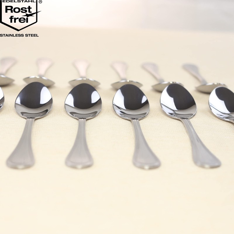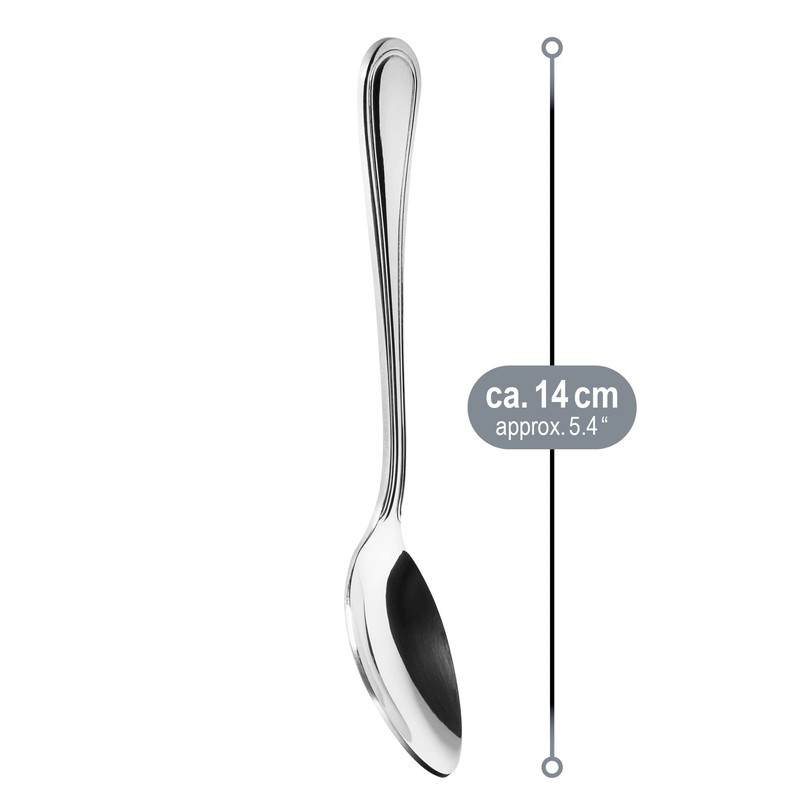 - Box contents: 12 x teaspoons. Material: stainless steel. Dimensions: approx. 14 x 3 cm (length x width). Colour: silver, highly polished