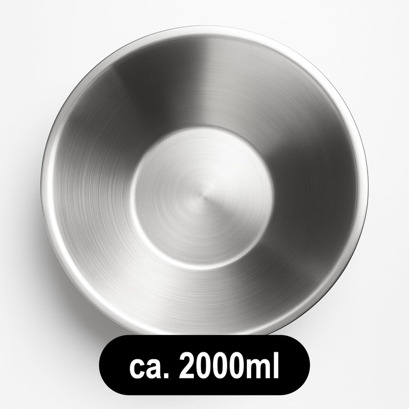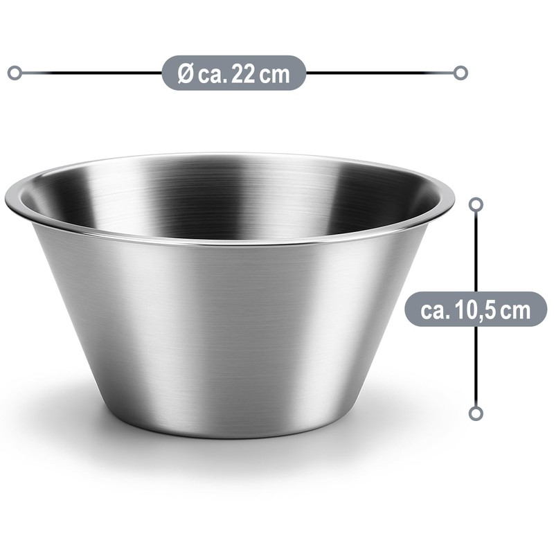 - Box contents: 2 x bowls. Dimensions of each: approx. 22 x 10.5 cm (diameter x height). Max. Volume each: approx. 2000 ml. Material: rust-proof stainless steel. Colour: silver. Other: food-safe